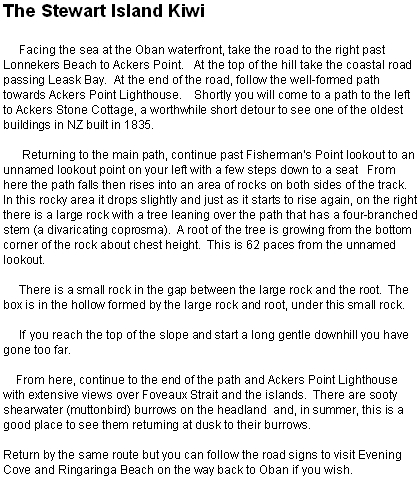 The Stewart Island KiwiStewart Island, New ZealandClues and placement by Team Krazy Kea, January 2005. Fill in the blanks to find the kiwi! Or download the answers instead. Fa_ing t_e sea at th_ Ob__ wat_rfr_nt, t_k_ _he r__d to t_e r_g_t pa_t Lon__k_rs_B_ach to A_k_rs P_int. At _he _op of t_e _ill t_k_ _he co_st_l r_ad _assing Le_sk Ba_. At _h_ e_d of _he r__d, fo_l_w _he we_l-fo_m_d pat_ t_wa_ds A_k_rs P_int Lig_th_o_se. Sho_tly yo_ wi_l c_me t_ a _ath to t_e l_ft to A_k_ers St_n_ Co_t_ge, a wor__wh_le s_ort d_to_r _o s_e _ne of th_ o_d_st bui_di_gs in NZ b_ilt in 1835. R_tur_ning t_ th_ ma_n pa_h, c_nt_nu_ pa_t Fish_rma_’s P_int l__k_ut t_ an u_n_med l__k_ut p_int _n _our l_ft w_th a fe_ s_eps _own to a se_t. Fro_ her_ _he pat_ f_lls _hen r_ses int_ an ar_a of ro_ks on b_th s_des of t_e tr__k. In _his r__ky ar_a it dr_ps sl_g_tly a_d ju_t as it st_rts to r_se ag_in, on _he r_g_t t_ere is a l_rge r_ck w_th a tr_e le_ni_g ov_r _he pat_ _hat h_s a fo_r-br_nch_d st_m ( a div_ricat_ng copr_sma). A ro_t _f th_ tr_e _s gr_win_ fr_m th_ bo_t_m corn_r _f _he r_ck ab_ut ch_st h_ig_t. T_is is 62 p_ces fro_ _he un_am_d l__k_ut. The_e is a sma_l ro_k in _he g_p b_tw_en t_e l_rge ro_k an_ th_ ro_t. T_e b_x is in _he h_llow f_rmed by th_ l_rge ro_k _nd r__t, und_r t_is sm_ll ro_k. _f _ou re_ch th_ t_p _f _he sl_pe a_d st_rt a l_ng g_ntle do_nhi_l yo_ _ave gon_ t_o f_r. From here, continue to the end of the path and Ackers Point Lighthouse with extensive views over Foveaux Strait and the islands. There are sooty shearwater (muttonbird) burrows on the headland and, in summer, this is a good place to see them returning at dusk to their burrows. Return by the same route but you can follow the road signs to visit Evening Cove and Ringaringa Beach on the way back to Oban if you wish. Thursday, 29 November 2007 09:58 PM |